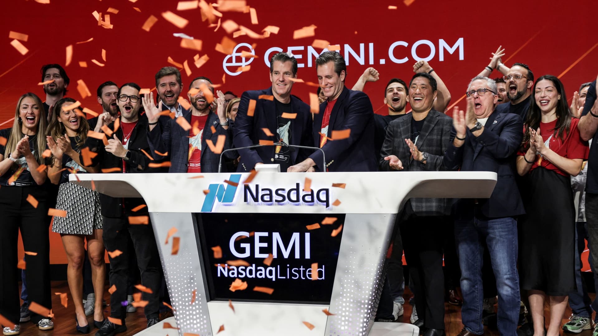 Gemini Co-founders Tyler Winklevoss and Cameron Winklevoss attend the company’s IPO at the Nasdaq MarketSite in New York City, U.S., Sept. 12, 2025. Jeenah Moon | Reuters Shares of Gemini