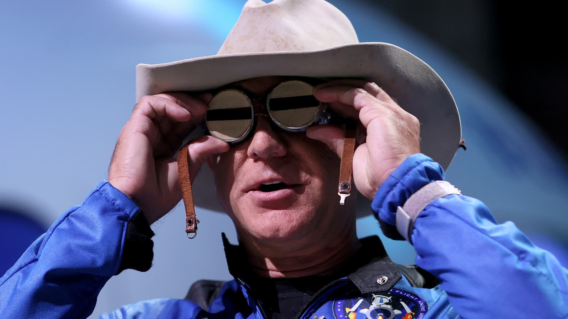Jeff Bezos holds the aviation glasses that belonged to Amelia Earhart as he speaks during a press conference about his flight on Blue Origin’s New Shepard into space on July